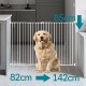 Extends from 82cm to 142cm. This extra-wide, extendable Dog gate with fit any space from 82cm to 142cm ( including brackets) without the requirement of any additional baby gate extensions.